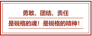 勇敢--敢于拼搏是銳格發展的根。不管遇到多少困難,面對多大的壓力,我本人和我們的團隊從來沒有妥協過,動搖過,沒有畏懼過。沒有越挫越勇的精神,就沒有今天的銳格!